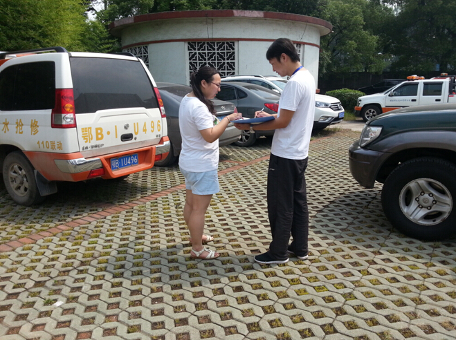 圖為:紀檢員在涼亭山水廠核對、查看車輛定點停放情況。