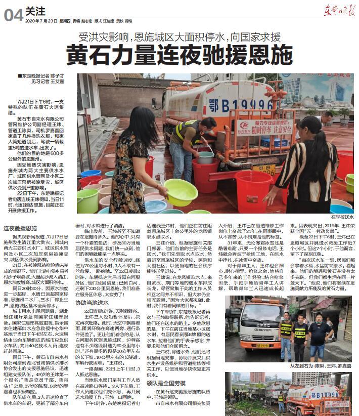 市自來水有限公司派專人支援恩施水司的舉動得到了《東楚晚報》記者關注,并于7月23日作了《受洪災影響,恩施城區(qū)大面積停水,向國家求援——黃石力量連夜馳援恩施》專題報道,引起廣泛關注和好評。