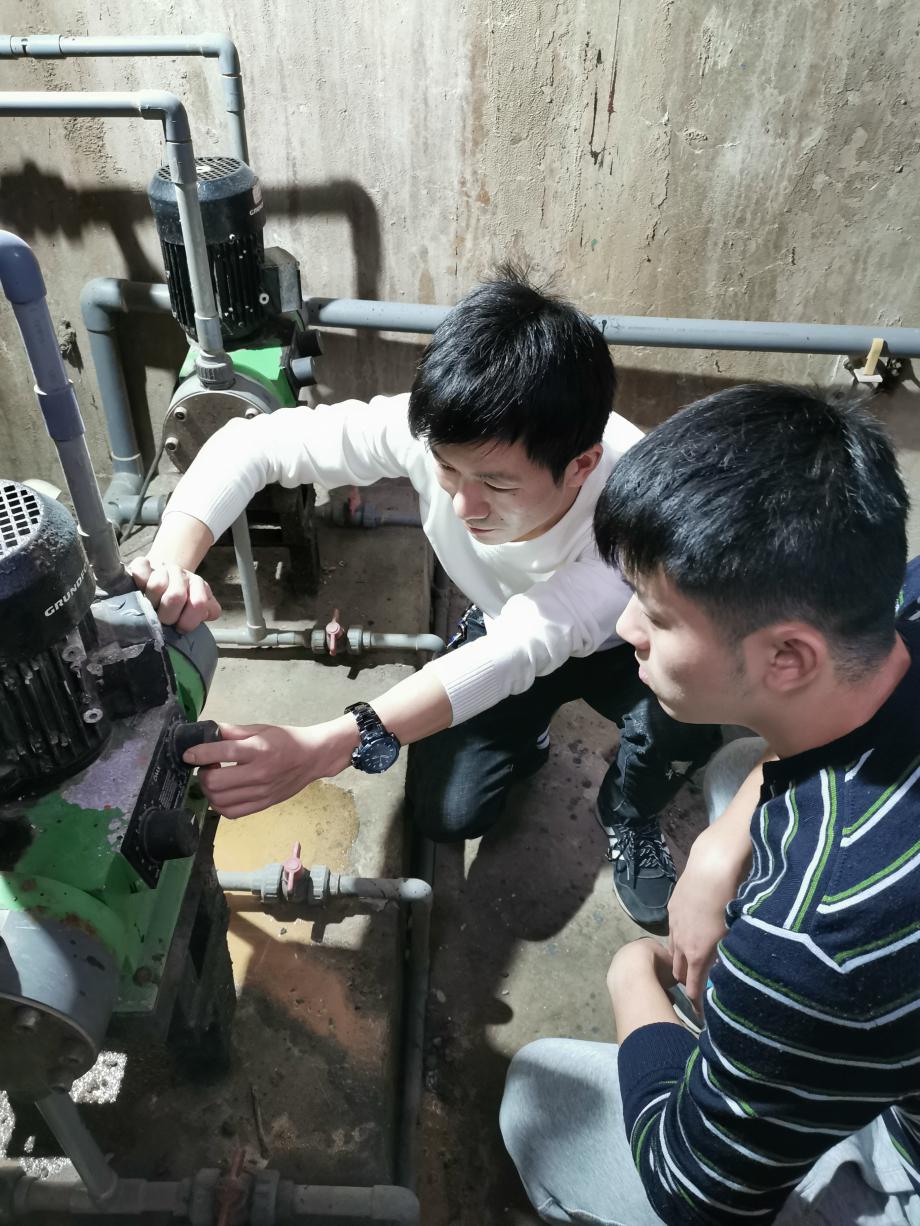 圖為競賽申創(chuàng)對象王家里水廠生產(chǎn)技術(shù)科科長嚴(yán)志勇發(fā)揮“傳幫帶”作用,帶領(lǐng)青工進(jìn)行技術(shù)改造。