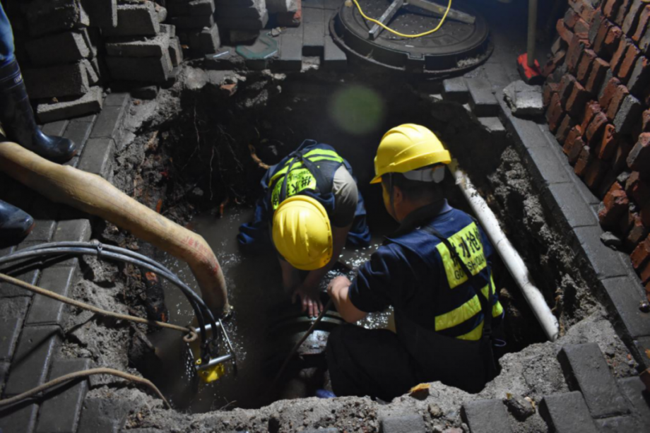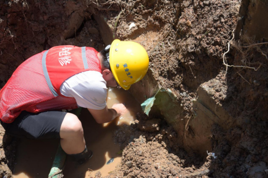 上午8時許,八卦嘴常青花園居民樓水壓下降,聽漏人員逐一排查下,找到PE63戶表管漏點,搶修一組工人挖開覆蓋的土面,維修管道。