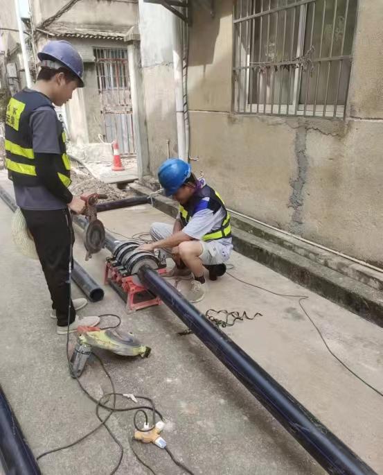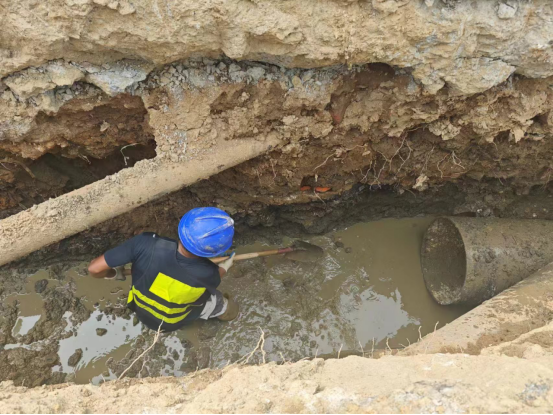 而與此同時(shí),20多公里外,廣州路DN600供水管道遷改項(xiàng)目施工現(xiàn)場(chǎng)。工人們正在清理溝槽、焊割工對(duì)施工的管件進(jìn)行切割。。。。。。各工序正有條不紊的推進(jìn)。