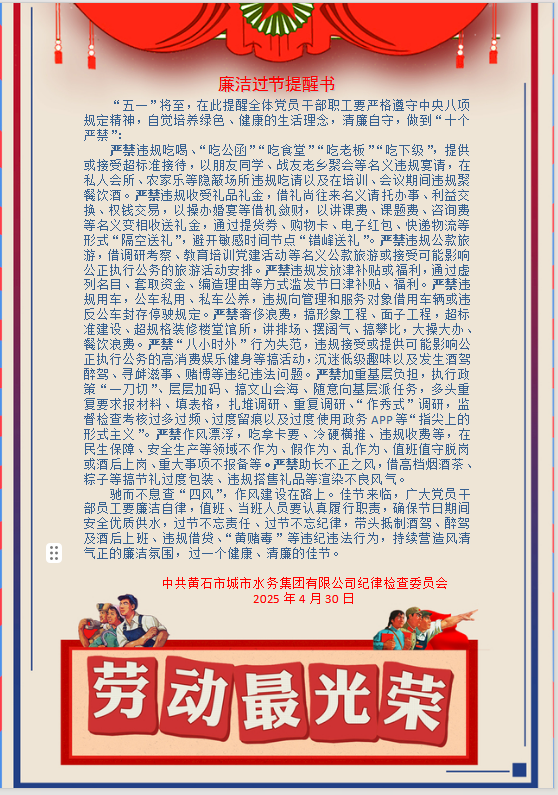 黃石水務(wù)集團(tuán)廉潔過(guò)節(jié)提醒書