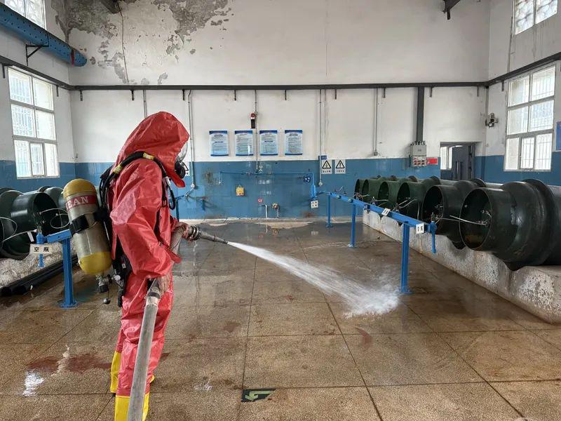 黃石水務(wù)集團制水分公司領(lǐng)導及應(yīng)急隊到場后,現(xiàn)場指揮轉(zhuǎn)為分公司級。搶險一隊、二隊穿戴輕型防化服進入泄漏區(qū)作業(yè),發(fā)現(xiàn)多處漏點且自動吸氯裝置故障,氯氣濃度劇增。分公司總指揮長隨即向集團申請啟動更高層級應(yīng)急響應(yīng)。