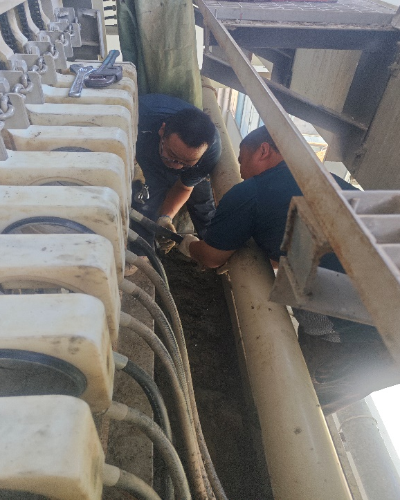 緊急搶修中,維修團隊更顯擔(dān)當(dāng)。花湖廠板框機濾布沖洗管更換,維修人員毫不猶豫鉆進設(shè)備狹窄空間,汗水如雨仍爭分奪秒,高效完成舊管拆卸與新件安裝;下陸DN1200閘門維修恰逢正午烈日,大家頂著高溫默契配合,順利完成作業(yè)。